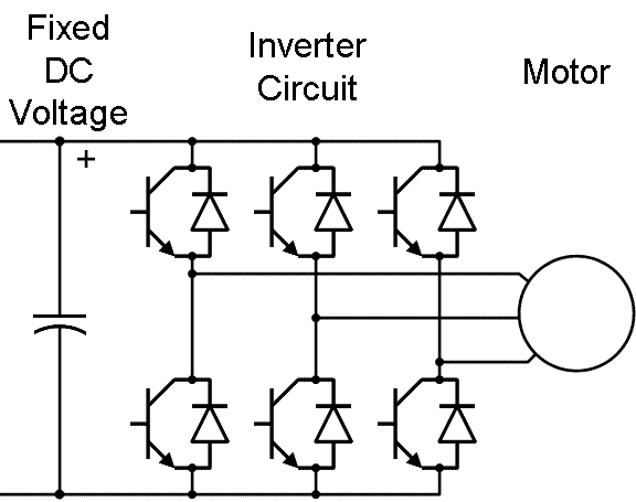 The basic type of converter used to control this type of motor is a three-phase inverter. This has six semiconductor switches, which can connect each phase of the motor to a positive or negative supply, and operate using PWM (Pulse Width Modulation) to control the phase currents of the motor.