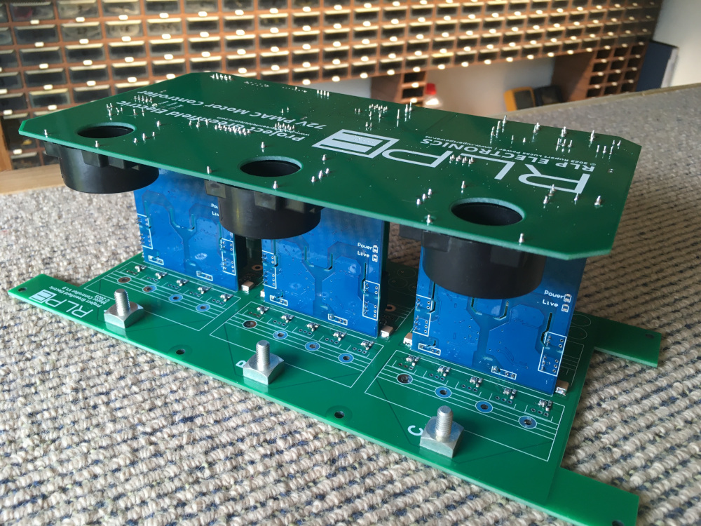 This is convenient as it means the sensors are close to where the signals are needed. It also meant I could make the bottom PCB 2mm thick for added rigidity and use 2 ounce (70 micron) copper there, without increasing the cost of the whole system, and I didn't need four-layer PCBs anywhere. The gate driver boards were in fact made using leftover PCBs from the same v1.0 design I produced for my inverter project, because they worked so well first time that I didn't see the need to make any modifications for this project.