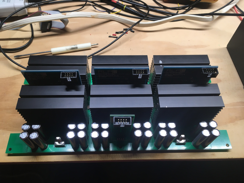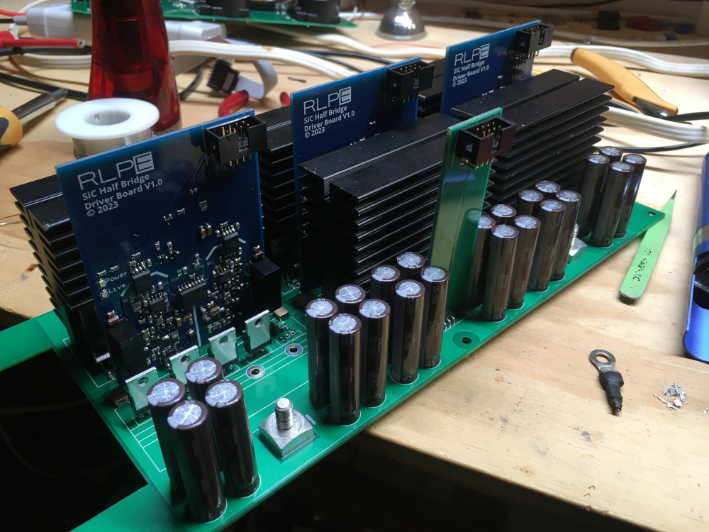 To make efficient use of 3D space, I opted to use a multi-board construction technique. I used one large power board at the bottom to house all the high-current components, namely MOSFETs, DC-link capacitors, and input/output connectors. Three vertical gate driver boards sit between the high and low side MOSFET banks for each leg of the inverter, with gate drive connections on the top side of the power board and large power planes on the bottom. At the top, the control board houses the microcontroller, signal processing and the three hall effect current sensors.